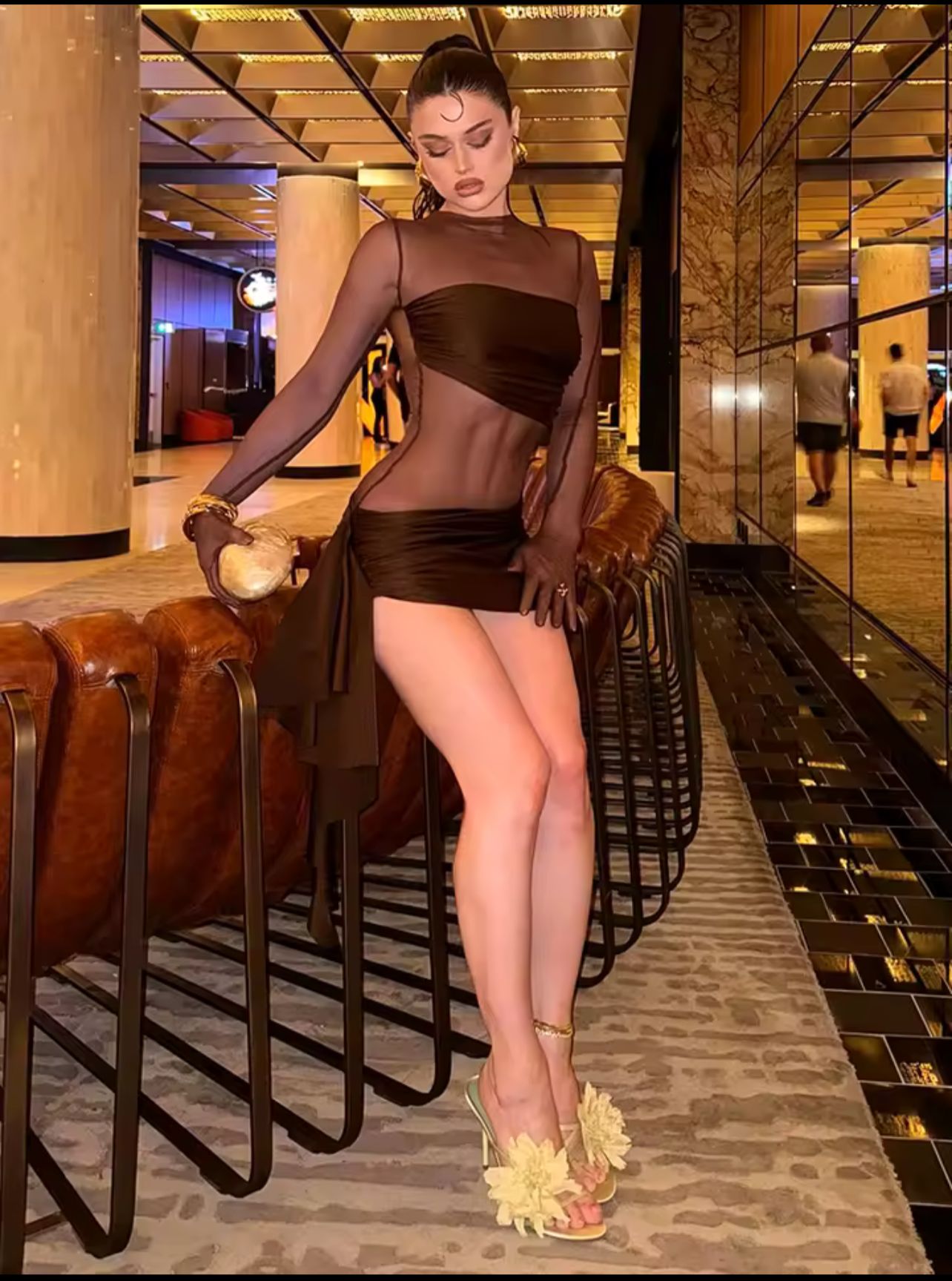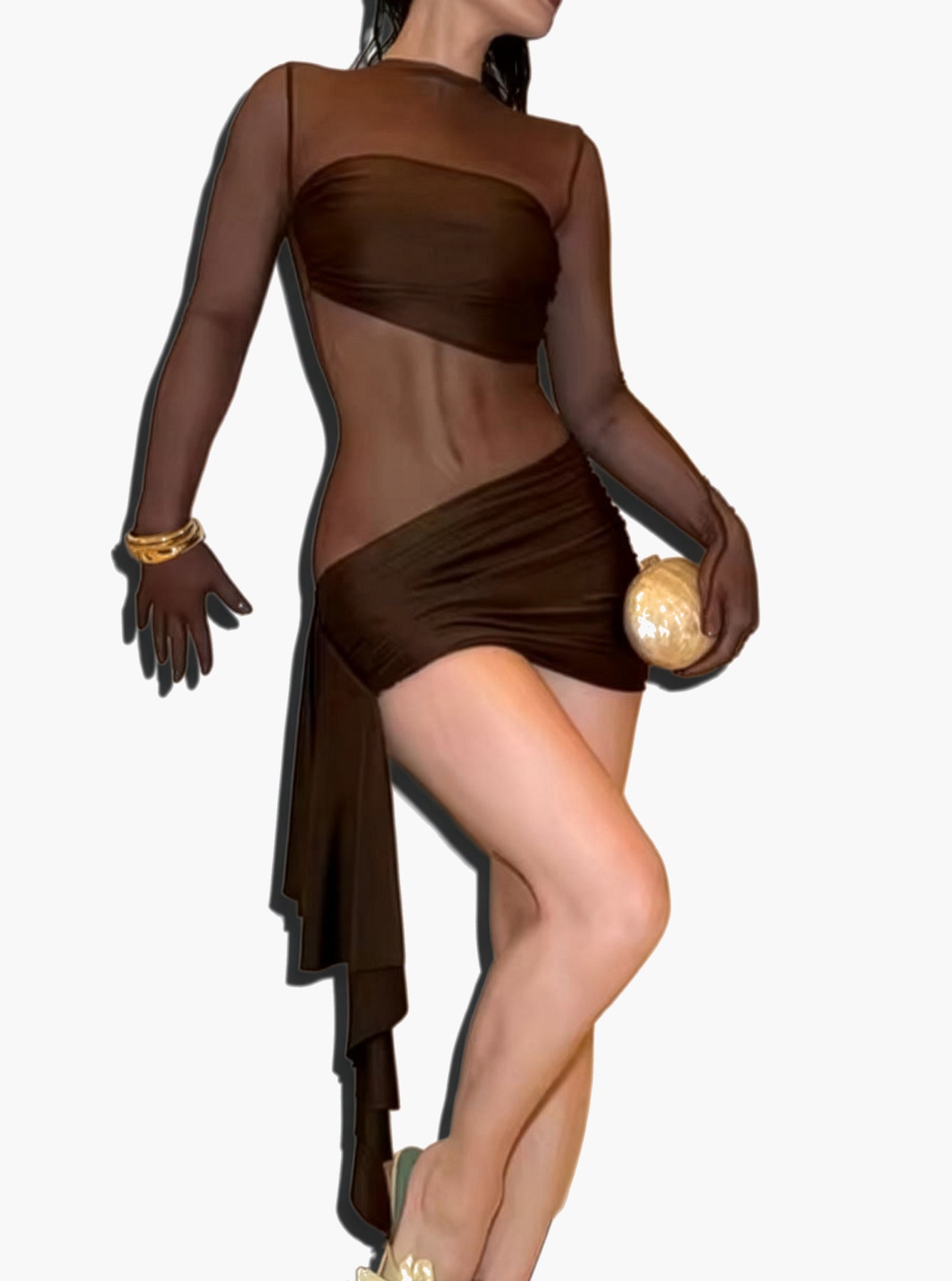This molten-chocolate masterpiece combines sheer temptation with sculpted symmetry, featuring a mesh upper bodice that melts into a smooth bandeau panel, creating a flawless hourglass illusion. The asymmetric mini skirt drapes effortlessly around the hips, revealing legs for days while the cascading side train brings movement, drama and unapologetic seduction. Dark, sleek, and impossibly feminine this is the ultimate KERRIVERRI night statement.