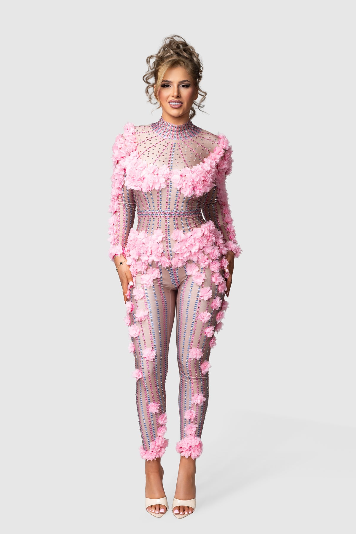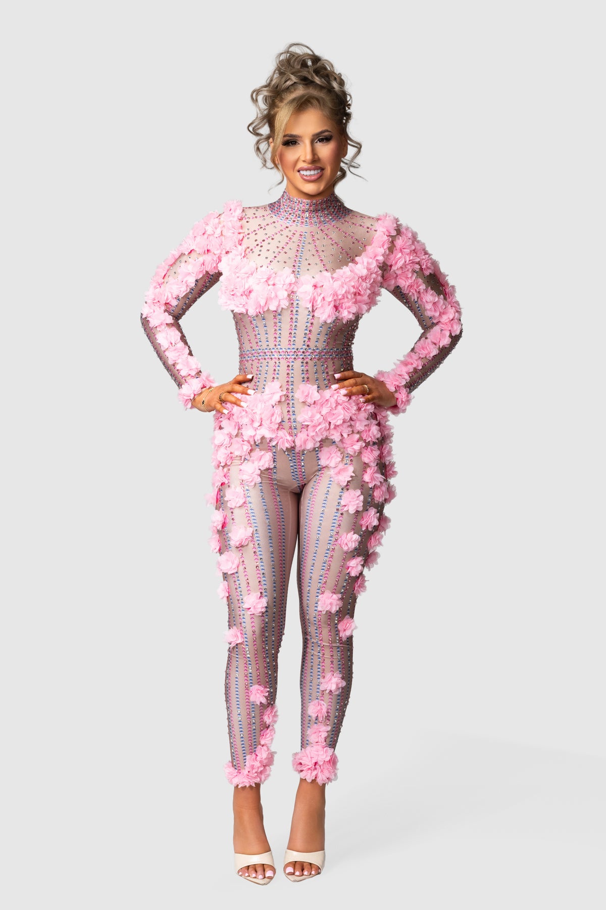 KAMILLE is a couture-inspired crystal catsuit designed to make a statement without shouting. Crafted on a sheer nude mesh base, this piece is delicately embellished with hand-placed crystals and soft blush floral appliqués that cascade across the body in sculpted layers.