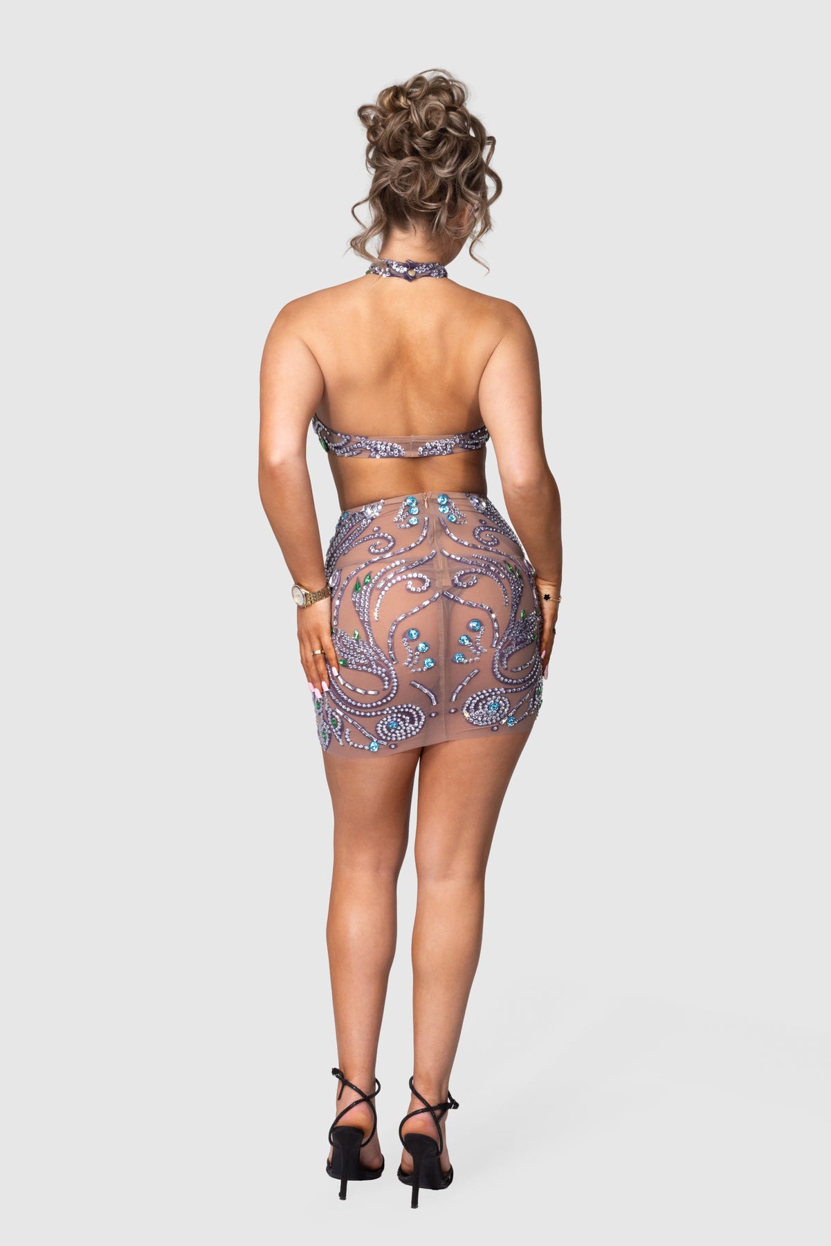KORÉLLE is a sculptural crystal mini designed to command attention. Crafted on a sheer nude mesh base, this statement silhouette features intricate hand-placed emerald and clear crystals that trace the body in a striking, contoured pattern.