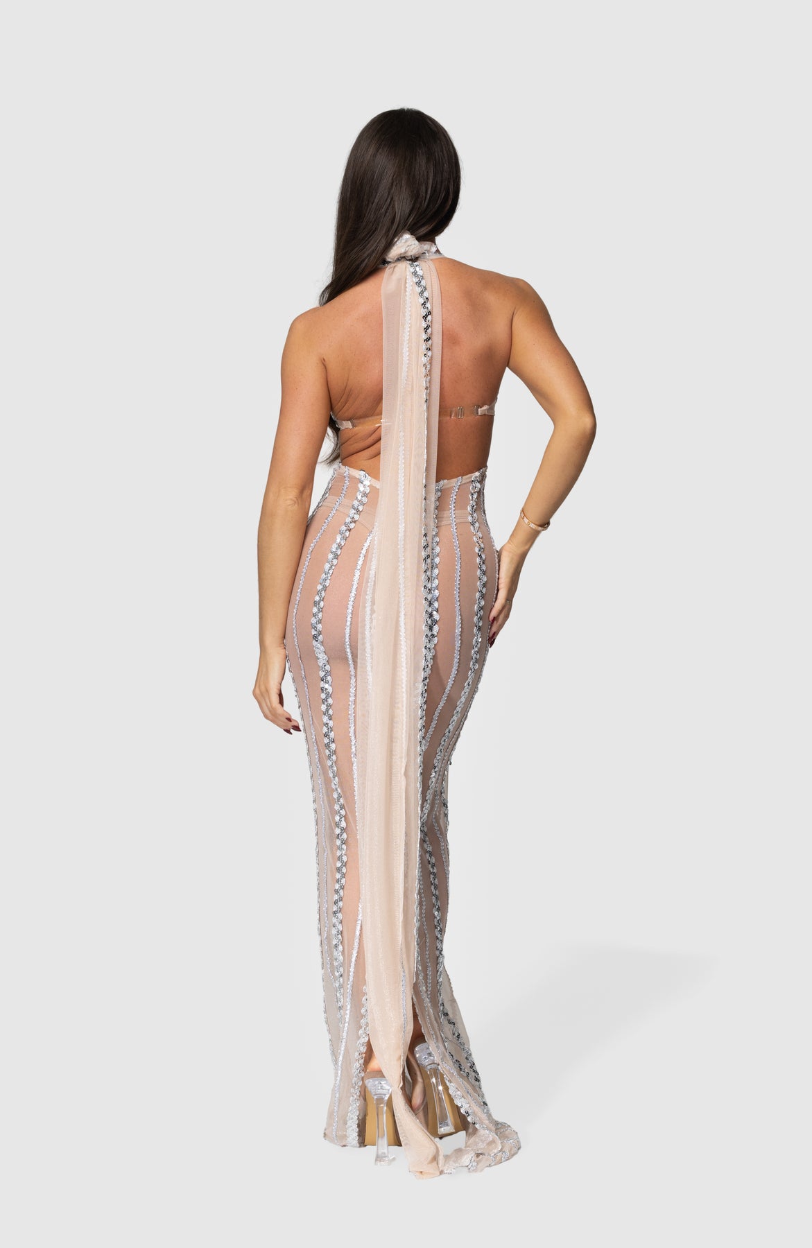 KYRA is a sleek, elongated crystal gown designed to elongate the body with vertical stone placement. Featuring a fitted silhouette and sheer base, this dress moves beautifully while maintaining structure and luxury.